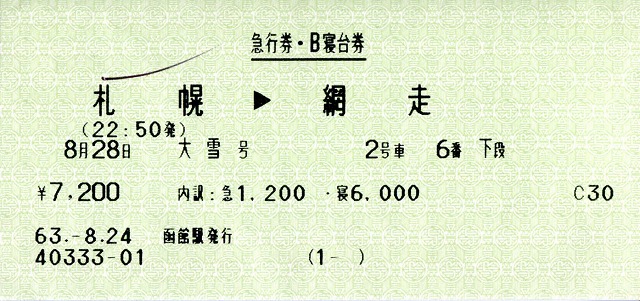 旭川をスタートし、富良野線、夕張線などに乗車した後、贅沢にも札幌から急行「大雪」のB寝台車で網走へ。
